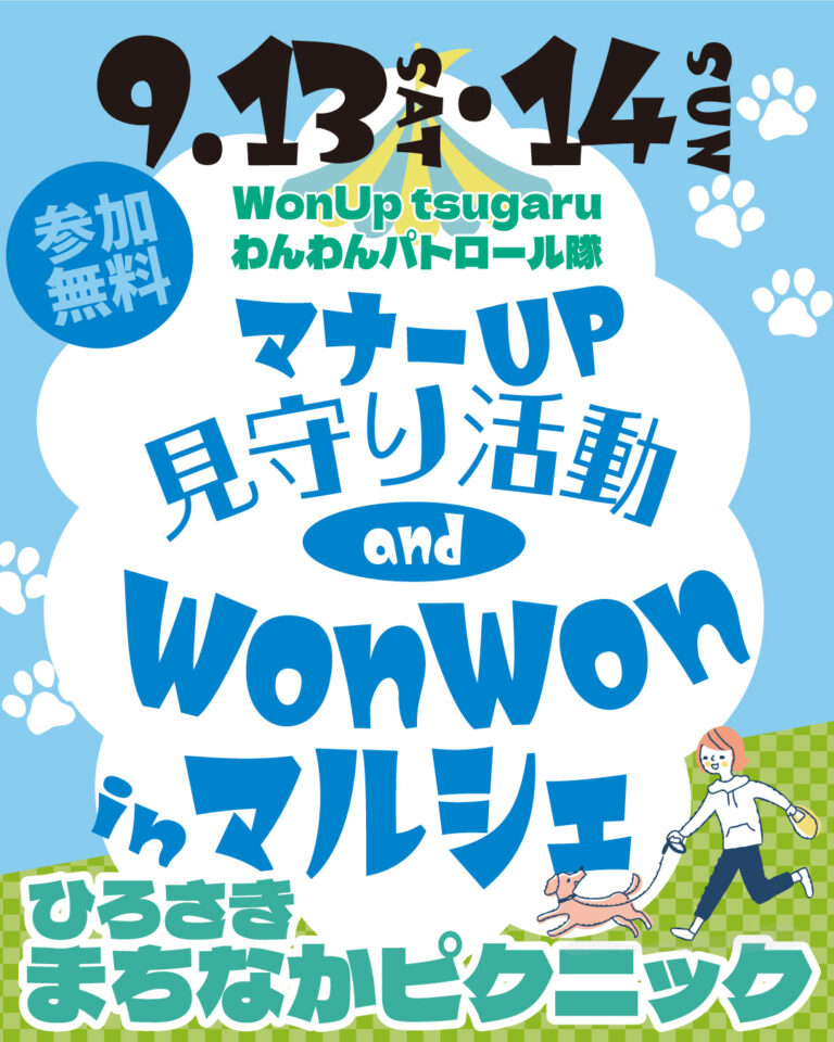 By STAFF / 2025年8月4日 14日(日)の開催は中止となりました 土曜日の夜間の突風で、会場が安全に使用できない状況となってしまい、日曜日も強風の予報が出てるため、残念ながら14日(日)の開催は中止とさせていただきます。 土淵川吉野町緑地の一部芝エリアが愛犬を連れての立ち入りがOKに! 芝生の上でお買い物やのんびりしながらちょっと特別なこの日を楽しもう♪ 今年3回目のWonWonマルシェは【ひろさき まちなかピクニック】と同時開催!レンガ倉庫美術館となりの土淵川吉野町緑地にて、愛犬もお子さんもご家族みんなで楽しんだり、お一人でものんびり過ごしたりできるイベントを今年も開催!この、特別な日が、あたりまえの毎日になるには、愛犬家のマナーへの意識次第!いつか全ての公園で愛犬とのんびり楽しく過ごせるようにみんなでマナーを守っていきましょう。 ※マナーアップ見守り活動は、当初の予定9時から10時に変更になりました。 愛犬をお連れの方はうんち袋、マナー水をご持参の上お越しください ひろさき まちなかピクニック2024の様子 たのしいお店がたくさん並ぶよ!出店内容はSNSをご覧くださいね! ▲近隣駐車場はこちらから確認できます▲ 犬用食品に関しては愛犬に安心して与えられるもの(産地・添加物など考慮されているもの)が条件となります。 明日からのドッグライフをより楽しくする、皆様のアイディアがつまった楽しい出店をお待ちしてます! ①物販・サービス・PR 4,000円(税込)/2日間出店例:愛犬用ごはん・おやつ、ケアグッズ。ファッション、首輪、モチーフ雑貨、似顔絵、しつけ教室PRなど ②飲食販売 6,000円(税込)/2日間出店例:パスタ、スープ、サンドイッチ、ランチボックス、ドリンク、スイーツ、愛犬用ランチ *テントは安全上及び夜間照明の都合により、主催側で準備するテントを連結して使用いただきます。・テーブルは別途レンタルもございます。・発電機、イスなどは出店者様でご用意ください。*火気を使用の場合は消火器のご準備もお忘れなく!⚫︎お申し込み前に必ず申し込みフォーム内の注意事項をご確認ください 出店お申し込みは終了しました 出店申込み〆切/2025年8月31日(日)